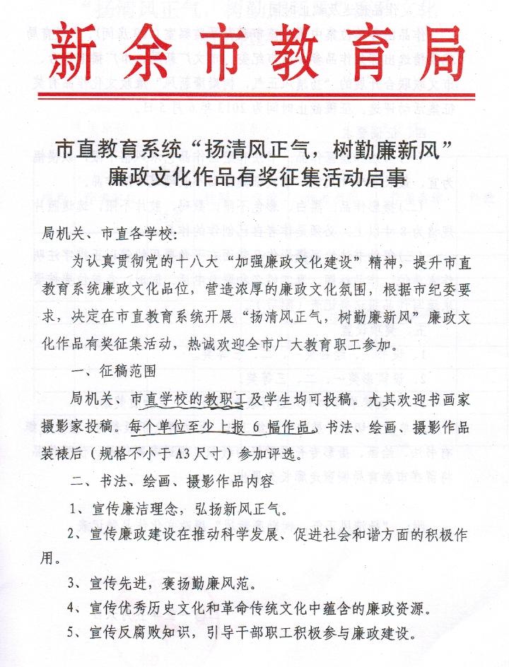 市直教育系统“扬清风正气,树勤廉新风”廉政文化作品有奖征集活动启事