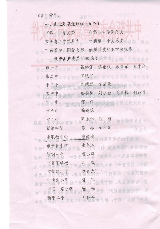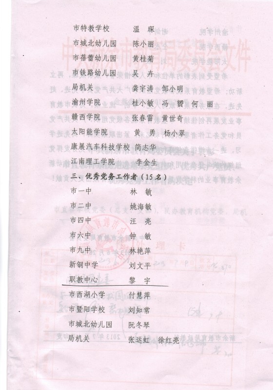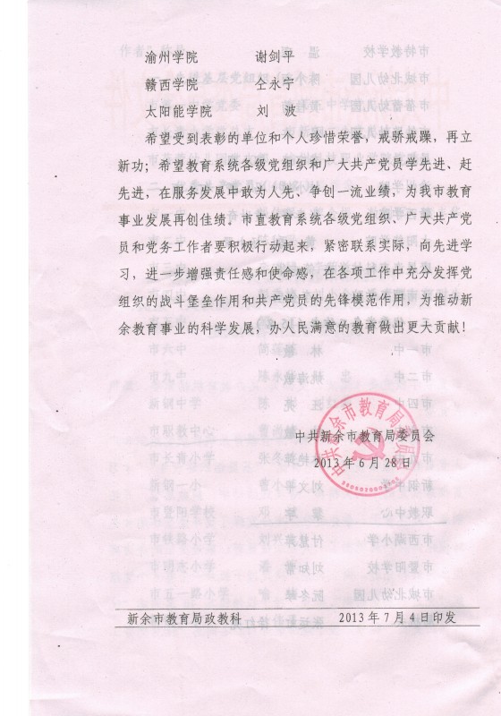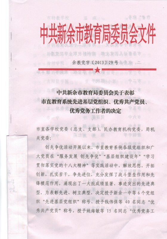 中共新余市教育局委员会关于表彰市直教育系统先进基层党组织、优秀共产党员、优秀党务工作者的决定