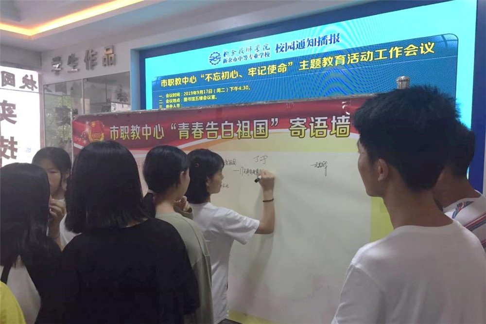 9月16日下午,市职教中心团委在教学楼大厅举行“青春告白祖国”寄语签名活动。刚刚下课的学生纷纷前来签名,向祖国深情表白。“我爱祖国”“我爱你!中国”“厉害了,我的国”等字句流露出职教学子对祖国深沉的爱,表现了诚挚的爱国情感。