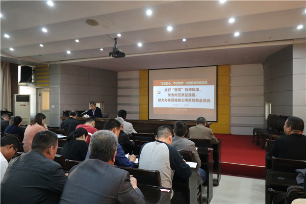 11月1日下午,市职教中心校长胡浩然在图书馆五楼会议室为全体教职工讲授题为“践行‘四有’教师标准,聚焦内涵质量建设,努力办老百姓放心满意的职业教育”的主题教育专题党课。