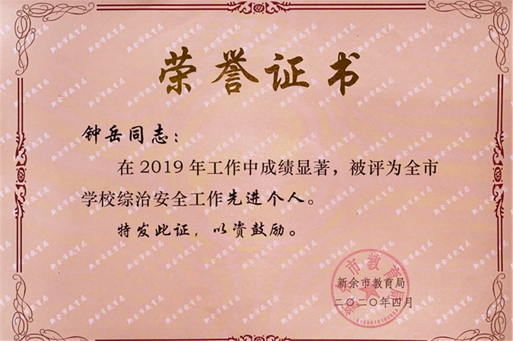 我校教师荣获2019年度全市优秀保卫干部、全市学校综治安全工作先进个人