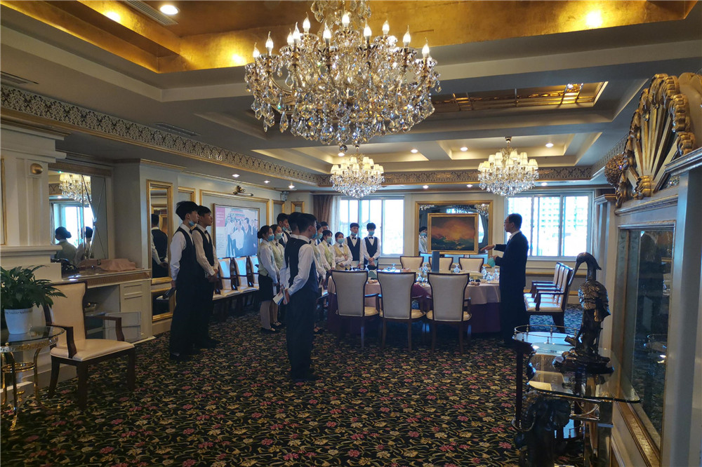 5月27日早上,天津鹏天阁酒店张总带着学生紧锣密鼓地进行岗前培训,熟悉酒店的各项规章制度及各楼层的具体分布,以便学生尽快熟悉自己的工作岗位,尽快适应角色的转变。