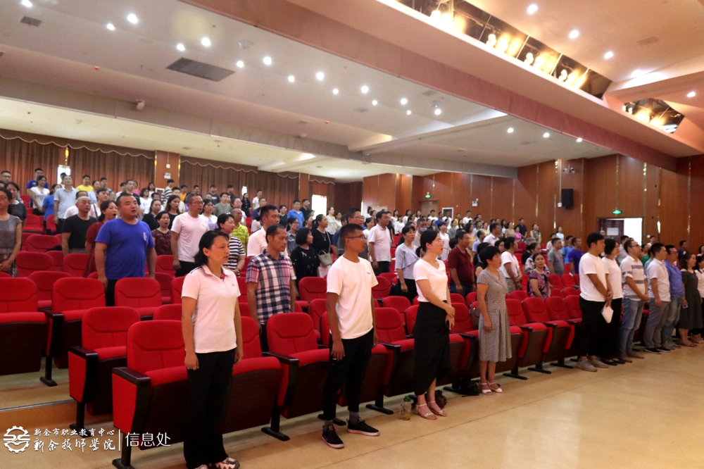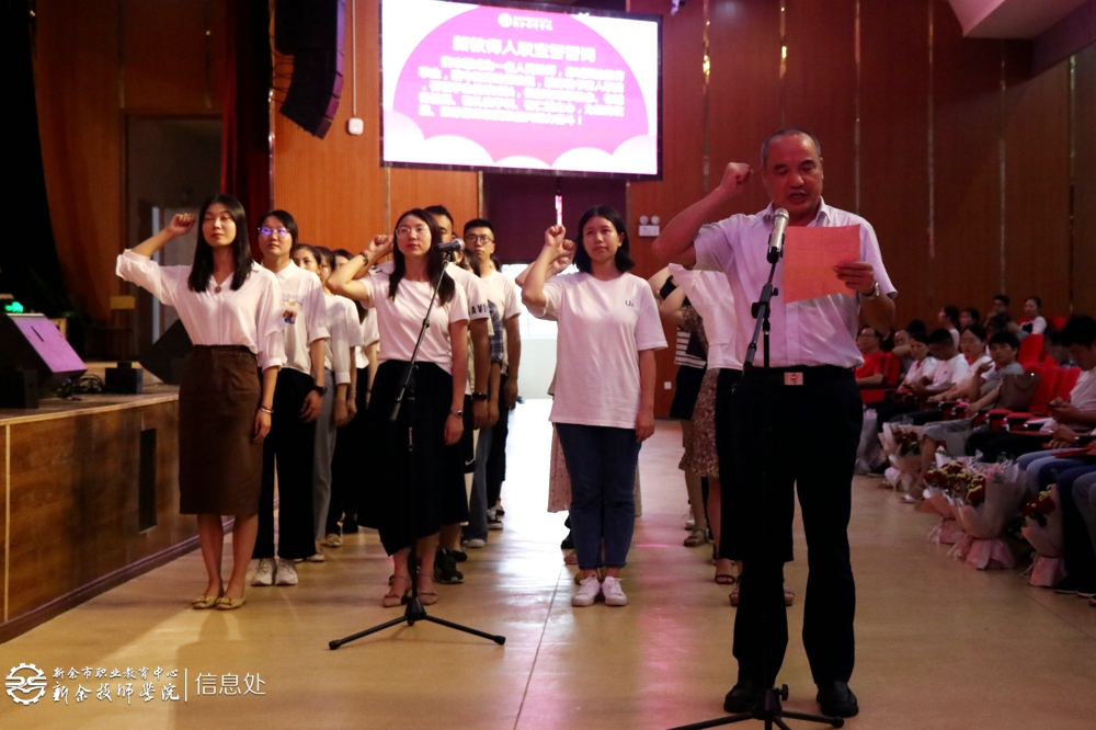 接下来,大会进行了新教师入职宣誓,在副校长李峰的带领下,25名新入职教师在主席台前进行了庄重的宣誓。