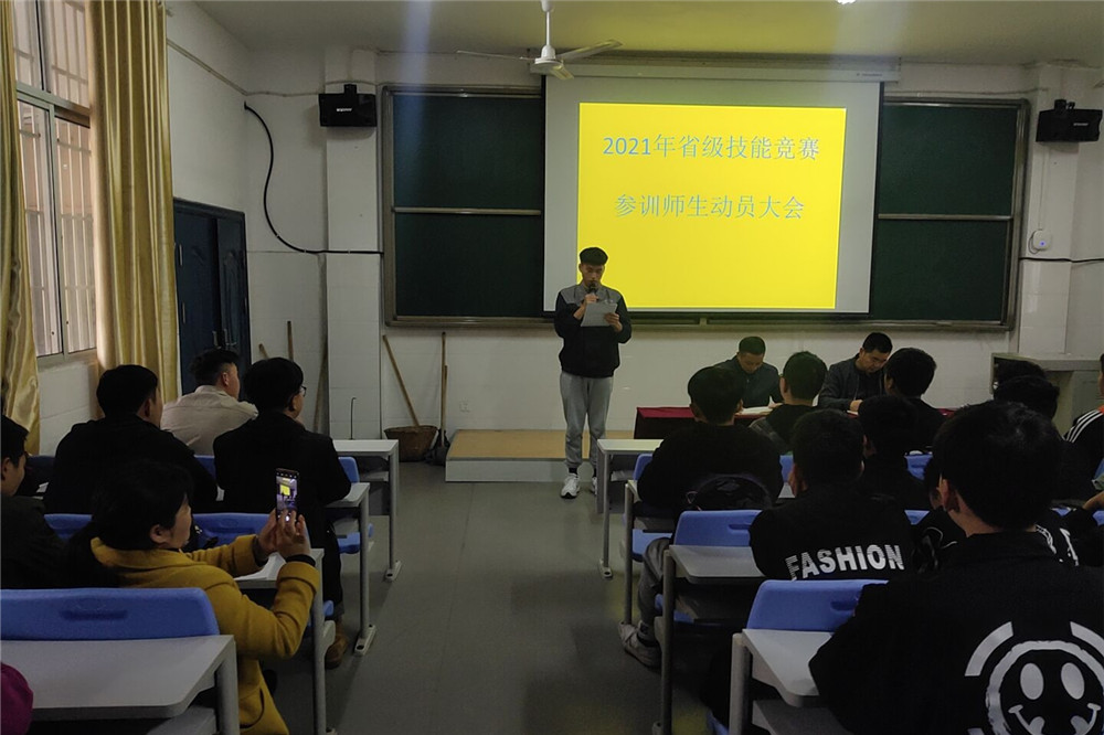 为更好的备战2021年省职业院校技能大赛,4月7日下午,市职教中心在教学楼B栋201阶梯教室召开了2021年技能大赛参训师生动员大会。分管校领导邹建峰、实训中心主任帅国勇以及各赛项的指导教师和学生共70余人参加了会议。