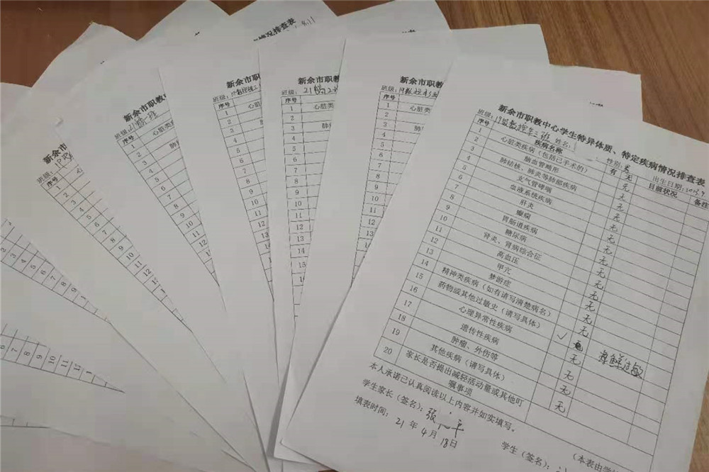 通过向学生和学生家长发放《新余市职业教育中心特异体质学生调查表》的形式。由家长及学生本人填写及签字确认,详细摸底调查学生的特异体质情况,如:先天心脏病、癫痫、肺结核,高血压、胃溃疡、哮喘、肺炎、肾炎、伤残以及其他严重的疾病,同时,根据调查摸底情况,对患病学生进行详细登记,汇总《学校特异体质学生健康档案统计表》,建立特异体质学生电子档案。对特异体质学生进行研究,确定适合参加的校内活动,明确要求班主任、体育老师及其他任课教师针对特异体质学生的个体情况,在学习、体育运动中因材施教。时刻关注学生的课内外情况及特异体质学生的健康动态,发现异常及时采取有效保护措施。为特殊学生提供有效的帮教,筑牢健康成长的屏障。