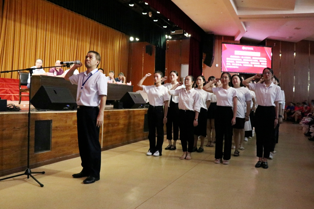 “我志愿成为一名人民教师,忠诚党的教育事业……”,在校长胡浩然的带领下,39名新入职教师进行了庄重宣誓。接着,受表彰人员代表上台发言。优秀教师谢俊为学校近期所获成绩倍感自豪,同时也深感责任在肩,表示将不忘教育初心,牢记育人使命,为学校发展做出更大贡献。优秀班主任付向辉分享了自己多年来带班的心路历程,“为职教事业更加美好的明天而努力奋斗”话语铿锵有力、掷地有声。