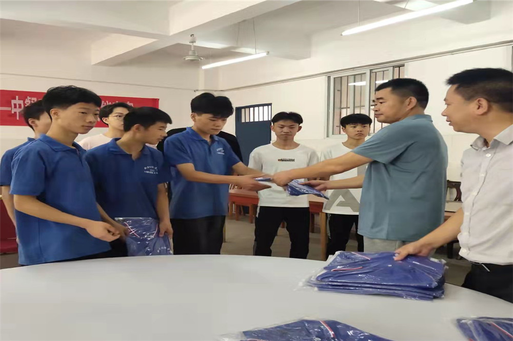 最后,邹校长给今年参加比赛的学生派发由企业赞助的训练服,加以鼓励。