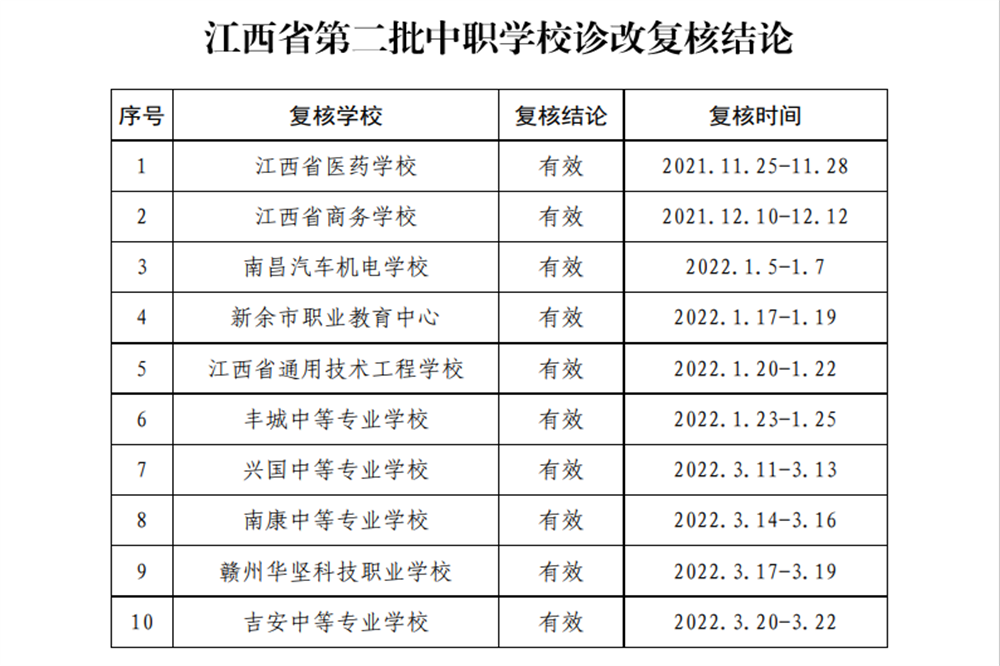 4月11日,江西省教育厅公布了江西省第二批中职学校诊改复核结论。经省中职诊改专委会认真研究,于2021年11月至2022年3月进行教学诊改工作现场复核的10所中职学校的复核结论为“有效”。新余市职业教育中心位列其中。
