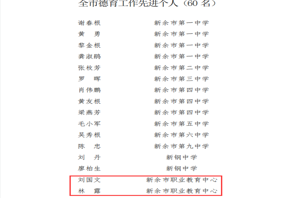 近日,新余市委宣传部、新余市教育局下发《关于命名全市“德育品牌学校”“德育标兵”“德育工作先进个人”的决定》,市职教中心被评为“新余市德育品牌学校”,刘国文荣获“德育标兵”“德育工作先进个人”,林露荣获“德育工作先进个人”。