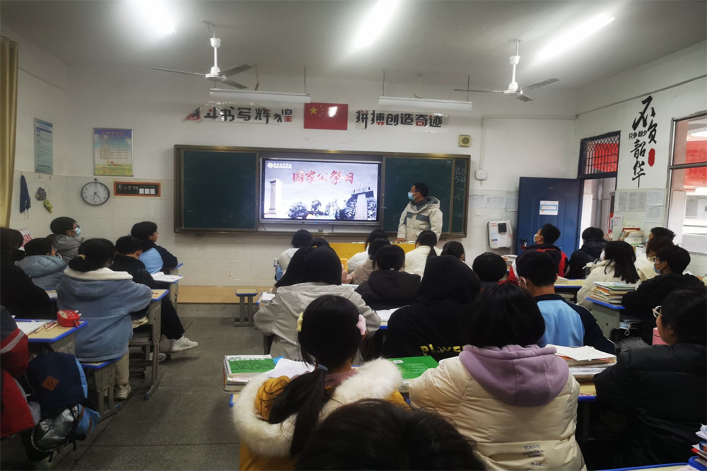 在主题班会上,老师们从设立国家公祭日的目的意义、日本帝国主义侵华战争中所犯下的滔天罪行、中国军民奋力抗击侵略并取得伟大胜利等方面,向同学们讲述那段令中华民族哀痛的历史。通过视频、图片,学生们深切感受到了战争年代的沉重,并且树立远大志向,以努力成才报效祖国为目标。