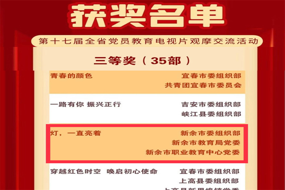 近日,市委组织部公布了《2022年全市党员教育电视片观摩交流活动获奖情况的通报》。据悉,在此次活动中共收到作品33部,评选出优秀作品10部,其中:一等奖作品2部,二等奖作品3部,三等奖作品5部。由新余市教育局党委和我校党委遴选报送的微视频作品《灯,一直亮着》荣获一等奖。同时,该作品被市委组织部选送省里三等奖。