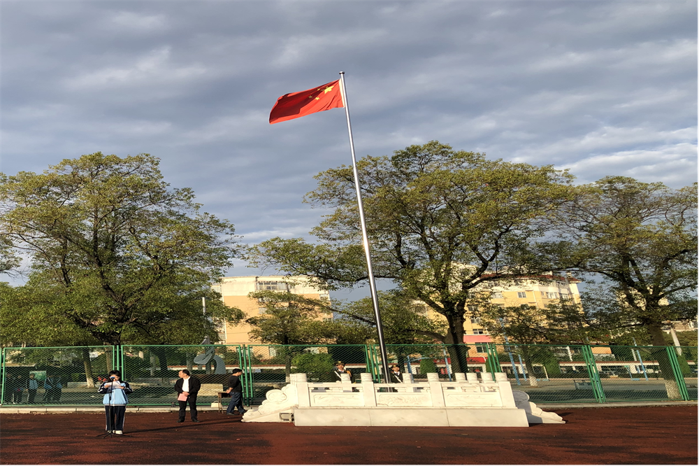 升旗仪式上同学们个个精神抖擞,队列整齐地站在操场上,等待升旗仪式的正式开始。庄严雄壮的国歌声中,鲜艳的五星红旗冉冉升起,随风飘扬,全体师生行注目礼。