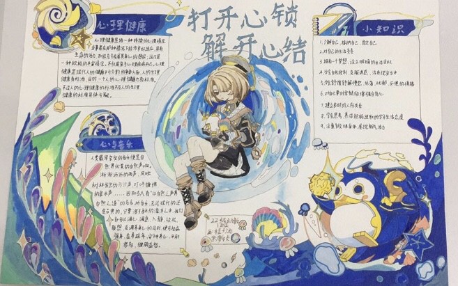 ⼀幅幅作品诠释着⼼理健康教育的精髓,⽤细腻的⽂字分享着⼼理调适的⽅法,为学⽣传达⼼理健康的标准,用巧妙的构思将大家带入奇妙的心理之旅,用扎实的绘画功底描绘出⼀幅幅精美的⼼灵王国,用暖⼈的⾊彩让⼼灵倍感温馨。