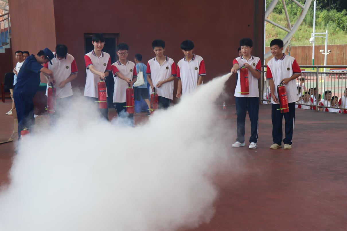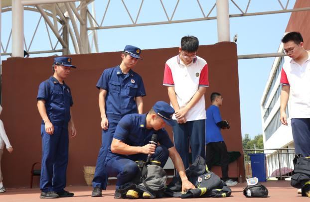 最后,为了能让学生们更直观地了解消防设备,消防队员展示了消防服、呼吸器、消防破拆机等专业设备,并详细介绍了它们的功能和使用方法。随后,学生们在消防队员的指导下,亲自穿上厚重的消防服,戴上呼吸机,体验了消防员在火场救援的艰辛与不易。此外,学生们还积极参与了灭火器的使用操作,掌握了扑灭初起火灾的基本技能。