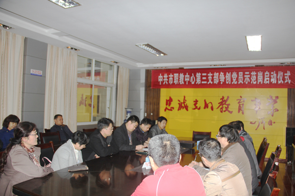 为了做好党员的管理和培养工作,积极发挥第三支部党员教师的先锋模范作用,让党员教师亮出党员身份,以自己的先锋模范作用表率于师生之中,表率于教育教学工作之中。16日下午,中共市职教中心第三党支部 “党员示范岗”创建活动启动仪式在学校图书馆三楼会议室举行。校党委书记胡浩然、副书记黎宇及第三支部全体党员参加会议,会议由校党委委员、副校长邹建峰主持。