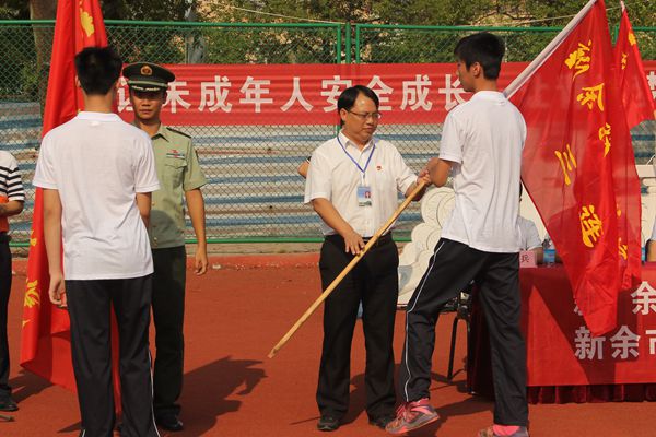 接着,武警新余渝水消防大队平安路中队队长涂引发表讲话,他希望全体学生做到严格要求、严格训练、服从命令、听从指挥,圆满完成军训各项任务。随后,刘焦华校长、涂引队长为各连队授旗。最后,刘焦华宣布2016级新生军训开幕。