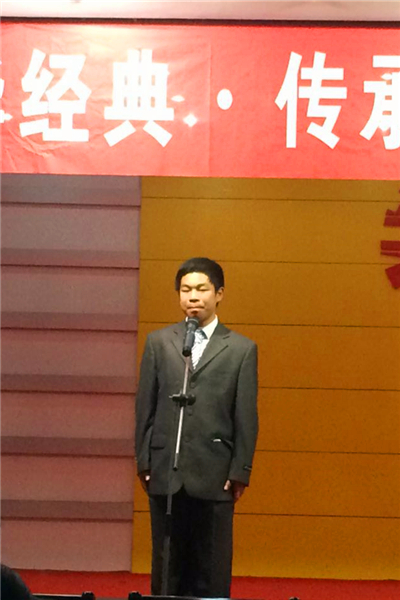 参赛选手们以饱满的精神状态、丰富的肢体语言、高涨的激情诠释了经典诗文的隽永魅力。“天地大矣,前途辽矣。美哉我少年中国乎”,来自15幼教6班的楼佳颖同学慷慨激昂地表达了对少年中国的热爱和期盼。13号选手李浩从容上场,在滚滚黄河的沉郁琴声中诵读李太白经典诗篇《将进酒》,李浩把李白怀才不遇的感叹、冲天的激愤之情和豪放的行乐之举表现的栩栩如生,精湛的表演赢得了现场观众热烈的掌声。屏幕上播放着由16计算机班精心制作的《雨巷》MV,音乐和江南小巷相辅相成,仿佛带领观众穿越到了1928年的江南雨巷,在情景剧中同学们身着民国长袍,手撑油纸伞,下着人工雨,边舞边吟诵《雨巷》,他们如倾如诉,细腻委婉,把诗歌朦胧恍惚愁怨的意境展现得淋漓尽致,将现场气氛推向高潮。最后,主评委付向辉老师对本场比赛进行精彩点评。