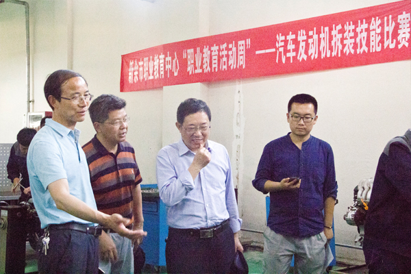 何处长一行参观了学校学前教育、工艺美术、模具制造等专业的学生作品展,并察看了工业产品设计(CAD)及汽车发动机拆装竞赛现场。随后,何处长听取了校党委副书记黎宇对学校“职业教育活动周”整体开展情况的汇报。