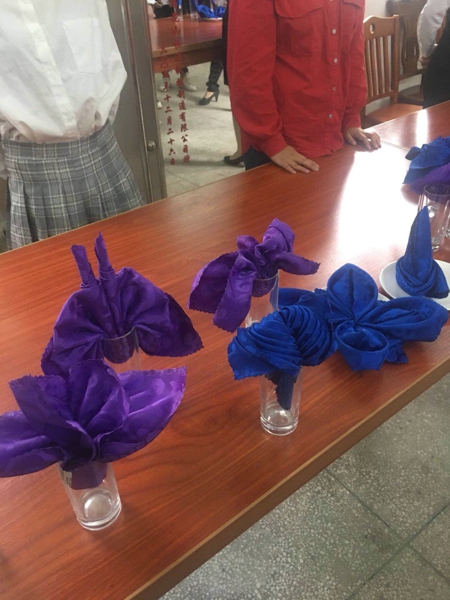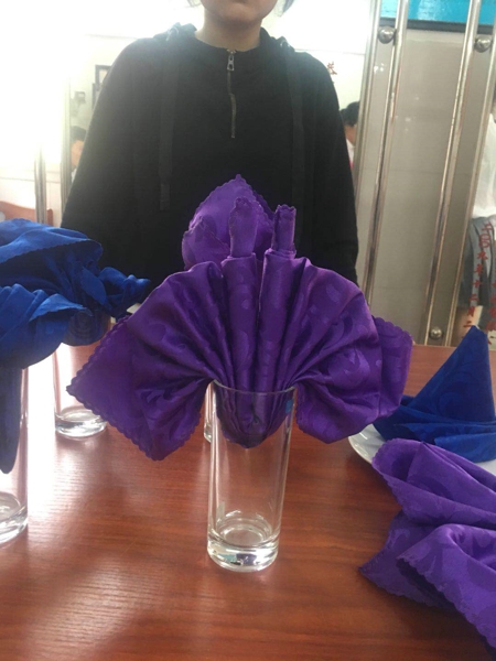 为了使学生能够将课堂所学知识运用于实践,能够具备一定的技能水平;同时开拓创新思维,激发创造灵感,充分展示自我才华,丰富学生的知识及技能,增强同学们的动手动脑能力,培养同学们的创新意识,我校于5月10日下午16点30,举行了中餐宴会折花比赛,赛场上,同学们表现的都非常出色,赛出了水平,所折出的花型,造型美观,花型逼真,在评委们的公平、公正、公开地评分下,产生了一、二、三等奖。